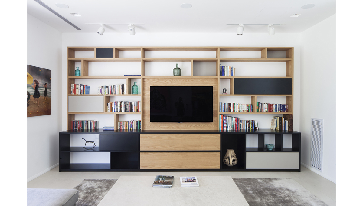 ספריית עץ אלון לבן בגמר לכה המשלבת אלמנטים כהים הופכת את קיר הסלון בבית לממד משמעותי שמקרב את הדיירים אל החלל הריק.